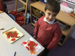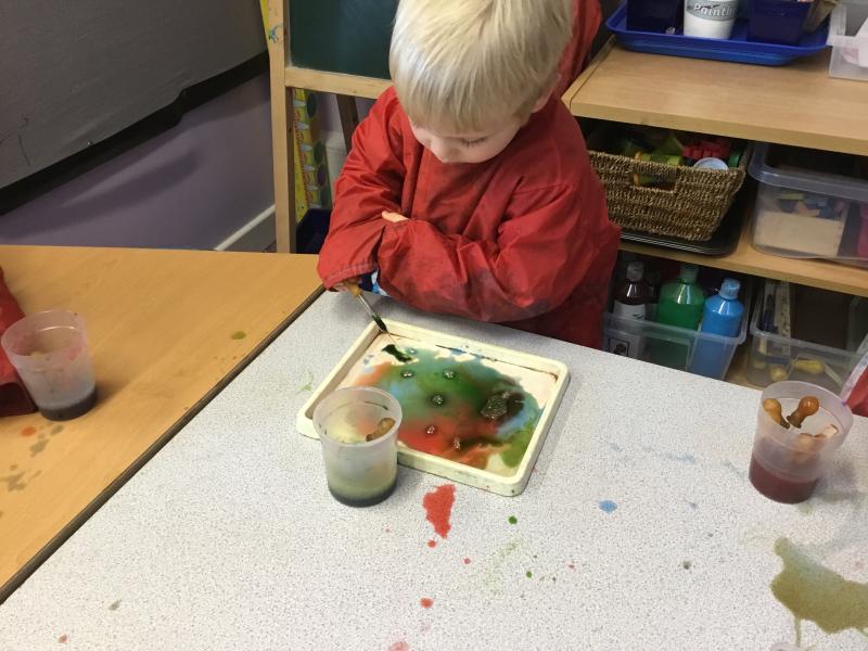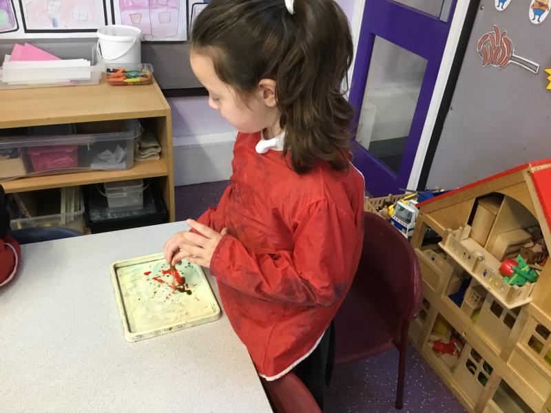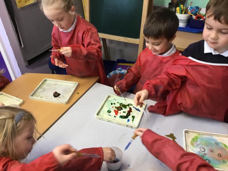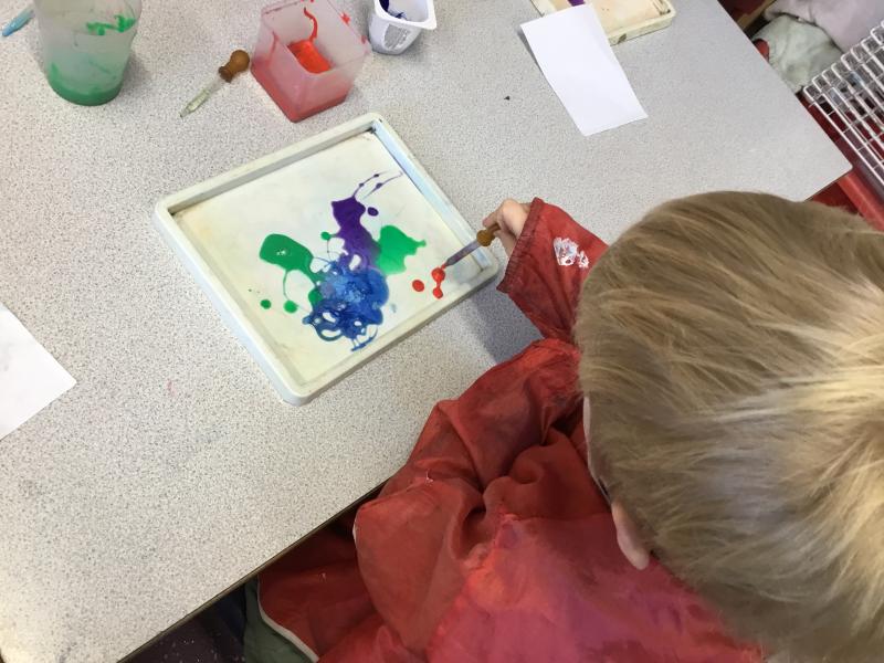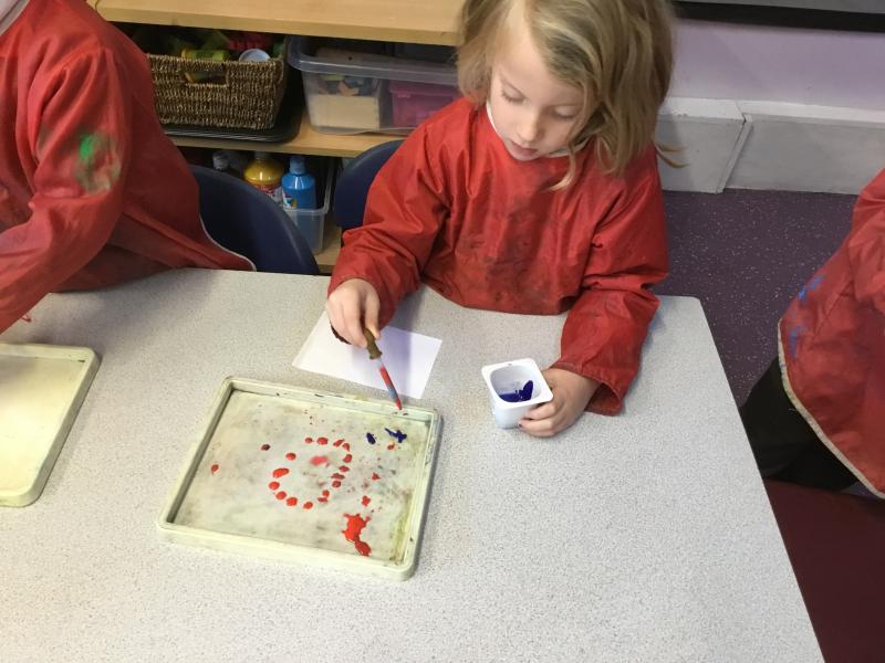 Today, as part of our work on fine motor skills, Dormouse class practised using a pipette to collect paint and then to make a pattern. We used paper to print our designs.
